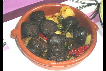 - en una cazuela de barro,se pone las patatas y los pimientos,con la cebolla rehogada todo ,para que coja el sabor se añade nuestra morcilla,se da un par e vueltas con cuidado,porque se pude desmenuzar la morcilla listo.