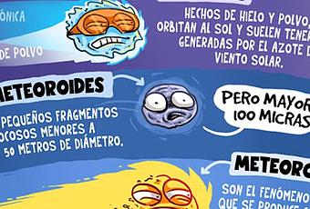 Conozca las diferencias:ASTEROIDES: Cuerpos rocosos y metĂĄlicos mĂĄs pequeĂąos que un planeta y orbitan alrededor del sol.COMETAS: Hechos de hielo y polvo, también orbitan al sol y suelen tener colas generadas por el azote del viento solar (cola iĂłnica, cola de polvo).METEOROIDES: PequeĂąos fragmentos rocosos menores a 50 metros de diĂĄmetro (pero mayor a 100 micras).METEOROS: Son el fenĂłmeno luminoso que se produce cuando los meteoroides se desintegran con la atmĂłsfera (Estrella fugaz para los amigos).METEORITOS: Son los meteoroides que no se desintegran en la atmĂłsfera y caen en la superficie del planeta.