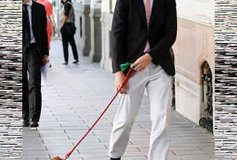 La imagen fue captada cuando el hijo de Naty Abascal sacaba ayer a pasear a su perrito por las calles de Madrid y suponemos que lo hizo después de terminar su jornada de trabajo o a la hora del almuerzo porque Luis lleva chaqueta azul, corbata rosada, pantalones claros y mocasines.