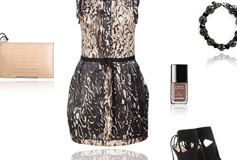 Vestido estampado: BDBA (262 €) - Sobre: Uterqüe (129 €) - Pendientes en forma de flor: Pandora (39 €)