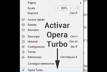 Una vez instalado presionamos el icono de Opera que se sitúa en la parte superior izquierda del propio navegador. Una vez se despliegue la ventana bastará con clicar la opción Opera Turbo como podeis ver en la siguiente imagen.