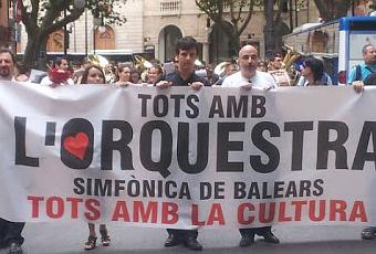 Los miembros de la Orquesta Sinfónica de las Islas Baleares enviaron el pasado día 11 una carta al presidente del Govern, José Ramón Bauzá, en la que le exponían la situación por la que atraviesan, con importantes recortes aplicados que "hace peligrar su viabilidad y futuro". Formación que ya cuenta con 24 años de vida, la Orquesta se ha convertido en la columna vertebral que articula la vida cultural de las Baleares. "Pero –se lamentan los músicos– nos encontramos con que nuestra querida orquesta está pasando un mal momento económico: el año 2012, nuestro presupuesto recibió un gran recorte y este año el Ayuntamiento y el Consell de Mallorca quieren volver a hacer otro aún mayor en nuestro presupuesto que está haciendo peligrar la viabilidad y el futuro de la orquesta". A los recortes, "absolutamente desproporcionados", si se comparan con los que han recibido otras orquestas del resto de España, en Comunidades Autónomas con menos poder adquisitivo que Baleares, el comité de empresa añade otros "grandes" problemas. El comité no está de acuerdo a la hora de encontrar una solución. "Ayúdenos a buscar una solución a la viabilidad y a la perdurabilidad de la Orquesta" le escriben a J. Ramón Bauzá, recordándole que es la única orquesta de las Islas que ofrece una gran variedad de conciertos, entre los de temporada, ópera, zarzuela, conciertos pedagógicos y familiares, ciclos de música de cámara, conciertos benéficos, grabaciones, conciertos en el resto de islas, giras internacionales, Festivales del Castillo de Bellver y el de Pollença... El comité destaca que la orquesta está pasando por un gran momento artístico, y "nos espera todavía un futuro muy prometedor, al encontrase con "unos músicos muy motivados, que están realizando tareas de manera desinteresada como son conciertos de música de cámara y conciertos pedagógicos, y la contratación de un nuevo maestro que nos dará un nuevo rumbo", concluye la misiva. La portavoz del Govern balear, Nuria Riera, que hace un mes fue acusada por el sindicato STEi-i de ser "una mentirosa compulsiva" y fue criticada por su "muestra de incompetencia y autoritarismo", confirmaba el viernes que las islas seguirán disfrutando de la Orquesta Sinfónica de Baleares, aunque avisó que esta institución cultural no escaparía de los recortes. Y, en la rueda de prensa posterior, Riera recordó que la Orquesta "arrastra históricamente una deuda importante" procedente de la legislatura anterior "por una mala gestión". Actualmente, su presupuesto es de 5,5 millones de euros que, para el Ejecutivo que preside José Ramón Bauzà, "no es viable". "Baleares –concluyó –necesita una sinfónica, pero también un servicio que sea viable y en eso estamos trabajando". Al día siguiente, desfiló por la Ciutat de Palma un pasacalles con una banda de cornetas y tambores como preludio de lo que iba a suceder, el hermanamiento entre ciudadanos e intérpretes gracias a la música, unidos al grito de Tots som música, Tots amb la cultura o Si, se pot (Todos somos música, Todos con la cultura o Sí, se puede). A continuación, desde el Born, repleto de gente, la orquesta interpretó el Himno a la alegría, la Patética, el Va pensiero, de Nabucco, El barbero de Sevilla, Don Giovanni o La Balanguera durante un concierto reivindicativo a favor de la misma, cuya continuidad está amenazada por los recortes. Desde el escenario, el director de orquesta, Felipe Aguirre, citando a Beethoven, dijo: "La música tiene una finalidad por encima de muchas otras: unir a los seres humanos". Cerca de 5.000 personas disfrutaron durante tres horas, de pie y sin dejar de aplaudir, con importantes invitados presentados por el humorista, Agustín, "El Casta". María Luisa Torres, violinista jubilada de la Sinfónica, aguantó las tres horas en primera fila "apoyando" a sus compañeros. Y, en declaraciones a los medios, los portavoces de la plataforma aseguraron que los trabajadores de la orquesta llevan dos meses sin cobrar y padecen continuos retrasos en los pagos de sus nóminas. Rechazaron la propuesta de reducir su plantilla en 13 persona y recortar un 20% el coste salarial, considerando que supondría el fin de la formación. Agustín "el Casta", que ejerció de maestro de ceremonias, resumió la filosofía del acto reivindicativo: "La orquesta –dijo– debe tocar, pero no nos deben tocar la orquesta". Defendió la "valentía" de los músicos que salieron a la calle para reivindicarse y criticó que los recortes se amparasen en la crisis económica "cuando no se ha reducido nada la larga lista de concejales, consellers, presidentes, asesores, parlamentarios, comisarios europeos...". Aseguró que los trabajadores de la orquesta llevan dos meses sin cobrar y padecen continuos retrasos en los pagos de sus nóminas. Y defendió que Baleares "tiene que ser digna de su orquesta" y no puede permitirse prescindir de ella. Finalmente, leyó un listado de otras sinfónicas, filarmónicas y formaciones regionales que apoyan a la Orquesta Sinfónica de las Islas Baleares: las orquestas de Murcia, Extremadura, Euskaki, el Principado de Asturias, Castilla y León, Comunidad de Madrid, Valencia, la Sinfónica de Barcelona, la Nacional de Cataluña, Ciudad de Granada, la Filarmónica de Gran Canaria, la Sinfónica del Gran Teatro del Liceo o la de Madrid. Durante el acto se proyectó en pantallas gigantes mensajes de apoyo de personalidades como Luis Cobos o la cantautora mallorquina María del Mar Bonet, que afirmó, a través de un vídeo: "Todos con la Orquesta Sinfónica, todos por la cultura".