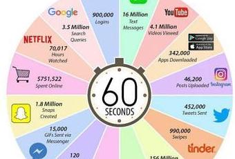 Según el informe Cumulus Media, en sólo un minuto se envían 452.000 tuits, se suben 46.200 fotos a Instagram, se crean 1,8 millones de snaps en Snapchat, se envían más de 15.000 archivos GIF a través de Facebook Messenger, se reproducen 40.000 horas de audio en Spotify, se mandan 156 millones de correos electrónicos y 16 millones de SMS, se pasan 990.000 vistazos de perfiles en Tinder, se reproducen 4,1 millones de vídeos en YouTube y se realizan unas 3,5 millones de búsquedas en Google.