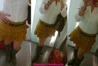 Ya en el ecuador de la semana , parece que ya vá quedando menos para el fín de semana. Hoy os traigo un look que he elegido deprisa y corriendo esta mañana. He combinado una falda en tono mostaza con botas en cuadros de tartán estilo british a juego de cinturón y uno de mis básicos que nunca faltan en mi armario que es una camisa blanca.