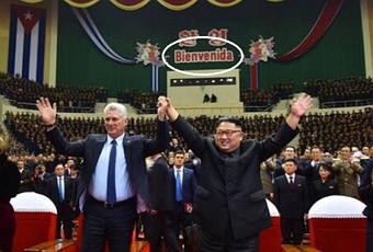 Colgado al fondo del Palacio de los Congresos de la capital norcoreana, donde el cubano y el dictador Kim Jong-un se presentaron para saludar a las autoridades del Partido Comunista de Corea del Norte, el polémico cartel dice: "Bienvenida", en vez de "Bienvenido".