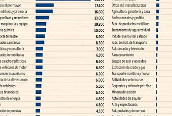 En quinto lugar, aparece la primera rama industrial: la fabricación de maquinaria y equipo, con 10.200 nuevos empleados. Con todo, el sector manufacturero es uno de los más beneficiados por la recuperación del mercado laboral, ya que tiene 14 de sus 24 ramas en positivo. Así, los bienes de equipo van seguidos por la industria química (10.000 ocupados más), la fabricación de plásticos y de vehículos (6.600 trabajadores en ambos casos) o la industria de la alimentación (6.000 personas). Este sector se ha visto muy impulsado por el aumento del consumo y de la compra de vivienda, que arrastra a muchas ramas de la industria. Además, también ha podido sacar la cabeza del agua durante la crisis, gracias a la flexibilidad introducida por la reforma laboral. En concreto, el sector del automóvil se ha visto muy beneficiado por la doble escala salarial, mientras que otras plantas han mejorado su eficiencia a raíz de la creación de nuevos turnos, que permiten aprovechar mejor las instalaciones ya existentes. Por otro lado, también destaca la intensa creación de empleo en algunas actividades muy vinculadas a la industria. En este aspecto, es necesario reseñar los 8.900 nuevos puestos de trabajo en el transporte terrestre y por tubería o los 4.800 del sector energético. Por otro lado, el sector servicios también concentra muchos y muy diversos nichos de creación de empleo, como es el caso de las actividades sanitarias (que añaden 8.300 personas al número de ocupados), la programación informática y consultoría (7.000), las actividades inmobiliarias (6.700), las actividades auxiliares a los servicios financieros y a los seguros (6.300), la venta y reparación de vehículos de motor y motocicletas (5.500) o los servicios financieros, excepto seguros y fondos de pensiones (5.400 ingresos al mercado laboral).Menos en el comercio