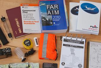 Cascos, tapones para los oídos, diario de vuelo, manuales, sujetapapeles, ipad, procedimientos de terminal, regla trazadora, bolígrafos, lápices, subrayador, tester de combustible, linterna, chaleco naranja para visibilidad, cámara.
