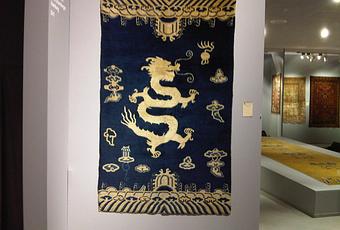 Esta bella alfombra de lana Paotou Drachen, proviene del interior de la autonoma región de Mongolia y data del año 1900, la figura del Dragon es dominante y representa el poder en la mitologia China, su fondode color azul hace relación al agua y la lluvia, la representación del tapiz junta estos dos elementos vitales como son : la fuerza del animal fantastico y el agua como fuente de vida.