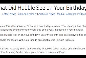 Por el 30 aniversario del telescopio espacial Hubble la NASA ha habilitado la página What Did Hubble See in Your Birthday en el que puedes colocar la fecha de tu cumpleaños y ver la imagen espacial más espectacular tomada ese día.