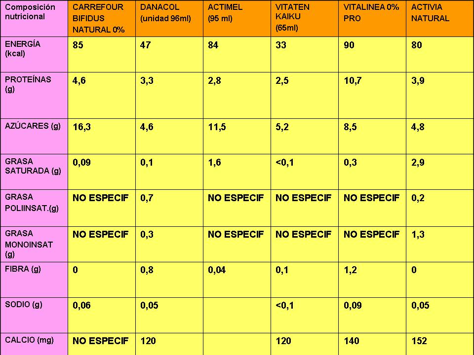 las marcas que he investigado son: DANONE NATURAL AZUCARADO, DANONE SABORES, NESTLÉ SABORES, CARREFOUR KIDS, GRIEGO DANONE, GRIEGO DANONE LIGERO, LA LECHERA YOGUR NATURAL, BIFIDUS NATURAL CARREFOUR 0%, SVELTESSE 0% DESNATADO, VITALÍNEA 0%, VITALÍNEA CREMOSO 0%, VITALÍNEA 0% PRO, ACTIVIA NATURAL, DANACOL, ACTIMEL, VITATEL KAIKU y DANONE DENSIA