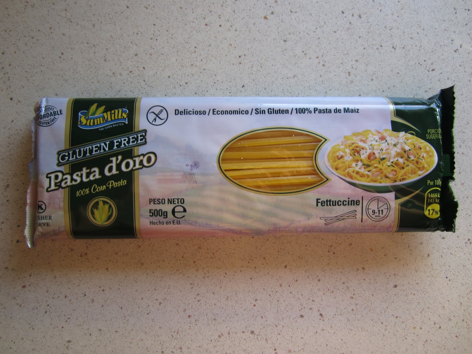 100% Natural, Pasta D’Oro Sam Mills es pasta baja en grasas, totalmente libre de gluten y con beneficios nutritivos adicionales. Pasta D’Oro no contiene trigo, huevo ni soja. Elaboradas únicamente a base de maíz y agua, sin conservantes ni colorantes, no GMO y con bajo índice glucémico. Mantienen su textura y sabor al cocinarlas.Hasta ahora toda la pasta sin gluten que había probado tenía una pega, pasa de estar al dente a ser “blandurria“, pero esta mantiene la textura en todo momento.