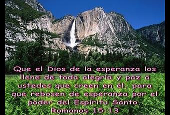 “Que el Dios de la esperanzalos llene de toda alegría y paz a ustedes que creen en él, para que rebosen deesperanza por el poder del Espíritu Santo”, Romanos 15:13.