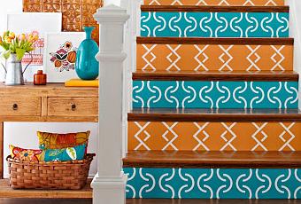 Nuestra propuesta es bastante "Daraminiana", como muchos de vosotros nos decís en algunas "Quedadas" anteriores, y justamente por eso hemos elegido esta preciosa escalera realizada con stencil y un contraste de colores realmente embriagador. Mostaza y azul se contraponen peldaño a peldaño y van adquiriendo protagonismo y dinamismo conforme la vamos siguiendo... La combinación con el mobiliario y los objetos de la entrada a la vivienda nos seduce por su incansable combinación...