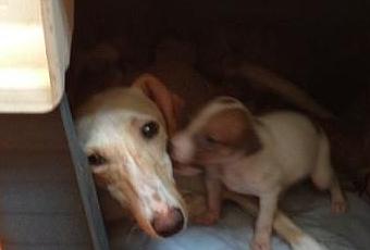 Queen ha sido recogida debajo de un camión en condiciones lamentables, llena de parásitos (tanto por dentro como por fuera) y esquelética. Con la sorpresa de que llevaba consigo 8 preciosos cruces de mini Galgos. Desgraciadamente la gente de la zona se enteró de su camada y le han quitado 2 cachorros... Ahora luchamos por Queen y los bebes que quedan, ella es toda una campeona pero tiene muchisimo miedo. Es muy silenciosa y no da ni un ruido.
