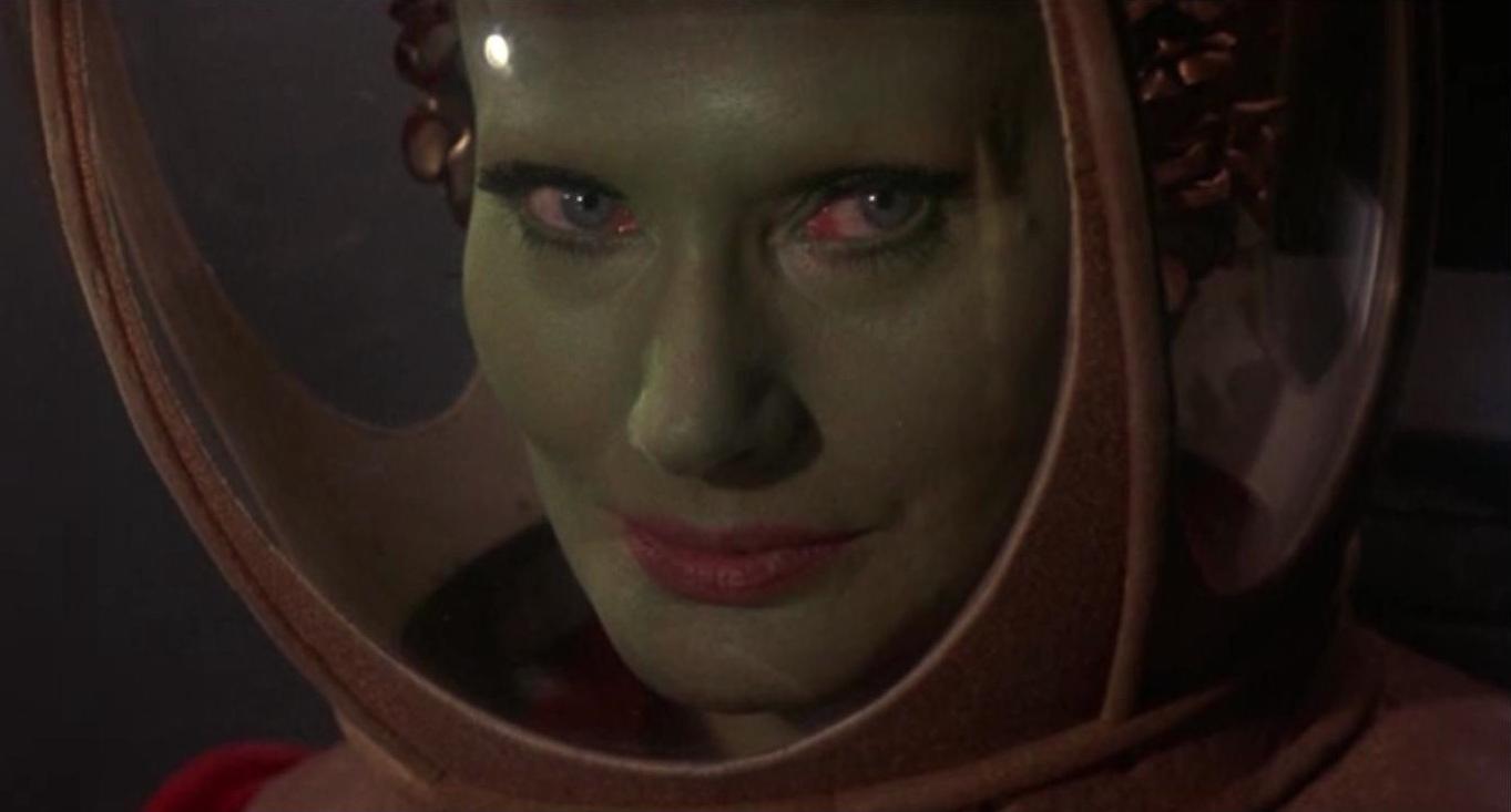 Con la llegada de la única sobreviviente de la nave extraterrestre al cohete terrícola, comienza la parte más interesante y entretenida del film. Florence Marly, quien en un principio no estaba en los planes de Roger Corman, debido a que este prefería a una actriz más joven, realiza un estupendo trabajo interpretando a esta alienígena de rasgos vampíricos. Si bien Marly no tiene ningún diálogo en la cinta, gracias a su presencia magnética, la gran expresividad de sus ojos y el gran trabajo de maquillaje de William Condos, logra imprimirle unas buenas dosis de suspenso a cada una de las escenas en las cuales participa. Para complementar este dejo de misterio que rodea a nuestra antagonista, gran parte de las escenas de violencia ocurren fuera de pantalla, demostrando que la violencia explicita no siempre es necesaria. Una vez iniciada toda una secuencia de truculentos sucesos, dominados por una atmósfera claustrofóbica, Harrington nos tiene reservados un par de interesantes (y curiosas) vueltas de tuerca, que la dan un valor agregado a la historia.