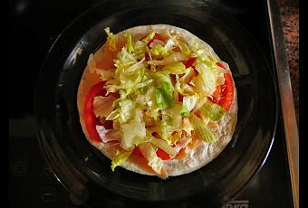 Ingredientes:- 4 tortillas mejicanas.- 4 lonchas de queso tipo tranchetes.- 2 cucharadas soperas de queso crema.- 100 gramos de salmón ahumado.- ¼ de lechuga tipo iceberg. - Un tomate.