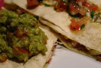 Tapar cada tortita con otra y hornear a 170 ºC (precalentar el horno) durante 10-15 minutos (no deben quedar muy tostadas pero el queso debe estar fundido). Servir acompañadas de guacamole y pico de gallo con totopos.