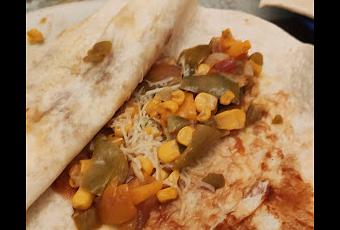 En la tortita de maiz, extiende un poco de salsa barbacoa, pon un poco de la mezcla. espolvorea con queso rallado.