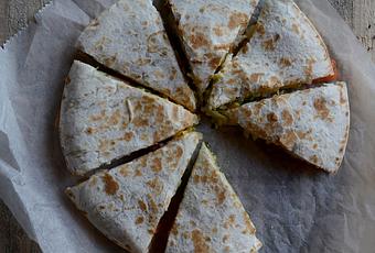 1- Picamos pequeñito la cebolla, el tomate, el cilantro y el aguacate. Le añadimos el maíz y los reservamos en un cuenco.2- Colocamos una sartén al fuego del tamaño de nuestra tortilla (mediana) y ponemoss encima la tortilla y sobre ésta la mitad del queso. Después repartimos bien las verduras picadas por encima de toda la superficie. Colocamos encima la otra mitad del queso y tapamos con la otra tortilla apretando sobre esta.3- Dejamos a fuego unos tres minutos hasta que el queso se funda, con ayuda de un plato le damos la vuelta y seguimos calentando por ese lado otros tres minutos o hasta que el queso quede fundido. Servimos caliente.