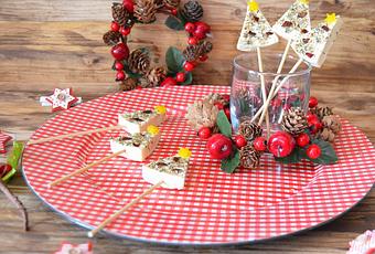 Cortamos los palos por la mitad, pinchamos los quesitos sin terminar de atravesarlo, espolvoreamos con las hierbas, le colocamos unos trocitos pequeños de tomates secos y en la punta le ponemos una estrella de pimiento amarillo que hemos hecho con el molde.