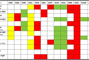 Esta semana toca analizar el queso en porciones, es decir: los quesitos. Para ello he estudiado los ingredientes de una docena de productos de diferentes marcas, encontrando algunos con solo dos aditivos, frente a otros que suman hasta un total de ocho. Para facilitar el análisis, he vuelto a recurrir a una tabla con los colores del semáforo. Este ha sido el resultado:
