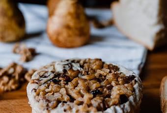Esparciremos las nueces por encima de los quesos hasta cubrir toda la superficie.