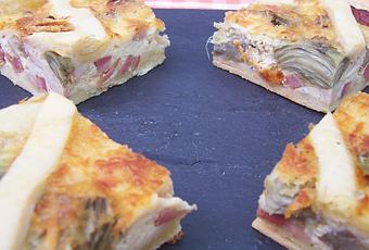 Extendemos la masa sobre la bandeja del horno y añadimos las alcachofas con el bacón y la cubrimos con la mezcla de leche y huevo.