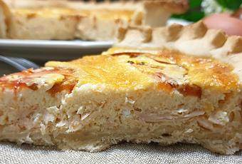 - Sacar la masa y dejar templar, verter la mezcla y colocar por encima tomate natural en rodajas. Hornear durante 20 minutos hasta que esté dorado por arriba.