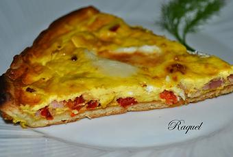 Una cebolla Dos huevos125 gramos de beicon a tacosUn pimiento rojo pequeño3 rodajas de queso de cabraSal y pimienta200 ml. de nataPreparación:Ponemos en un bol la harina tamizada y la mantequilla partida a trozos pequeños.Ahora hay que mezclar lo con los dedos como si lo desmenuzaremos hasta que queden todo bien integrado.Añadimos la sal y el huevo y volvemos a mezclar hasta que este todo los ingredientes mezclados, formamos una bola y lo dejamos en un bol humedecido con una gota de aceite para que no se pegue y lo dejamos reposar durante una hora, tapado con film.Pasada la hora estiramos con el rodillo la masa y la ponemos sobre el molde, que habremos untado ligeramente con aceite para que no se enganche la masa.Pelamos y cortamos la cebolla en trozos pequeños, la freímos, mientras cortamos el pimiento y lo añadimos echamos sal y pimienta, cuando estén las verduras echamos el beicon lo salteamos un poco y reservamos.