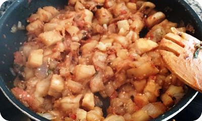 Pon aceite en el fondo de la sartén a calentar. Pica la cebolla y sofríe en el aceite. Añade la berenjena sin piel y cortada a trozos pequeños .