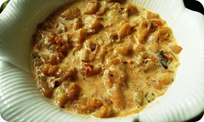 En un bol bate los huevos junto con la nata. Agrega el sofrito de berenjenas.