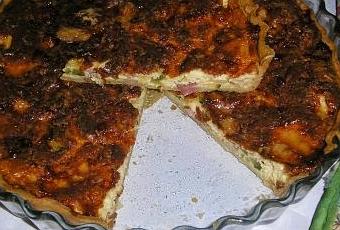 Ingredientes:3 huevos75 gr de beicon en taquitos2 calabacines medianos1 cebolla125 ml de nata líquida150 gr de queso emmental ralladoaceite de olivapimientasal1 lámina de pasta quebrada