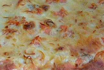 - En la base de la masa, después de reposada 30´ en la nevera, poner la cebolla y calabacín y extender. Cubrir con un batido de 3 huevos, un brick de nata líquida, sal, pimienta y 2 cuch de queso rallado. Poner encima 100 grs de salmón ahumado troceado y un poco más de queso rallado. Hornear a 200ºC unos 40´, hasta que esté dorada.