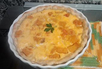 Se baten los tres huevos y se distribuye por encima del carruécano. Se mete en el horno aproximadamente 15-20 min o hasta que se vea el huevo cuajado y los bordes de la masa doraditos.