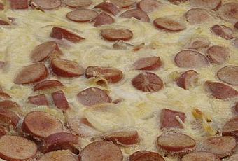 Para el relleno cortamos las cebollas en discos finos y las rehogamos en la mantequilla, a fuego suave, hasta que estén transparentes. Las escurrimos y reservamos. En la misma mantequilla freímos ligeramente las salchichas previamente cortadas en rodajas finas. Reservamos.