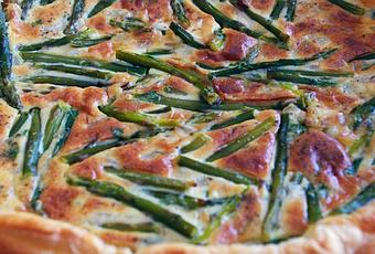 Ingredientes: 1 masa hojaldre redonda; 2 manojos espárragos verdes finos; 2 ramas perejil fresco; 1 cebolleta; 200 ml nata; 3 huevos; 70 ml vino blanco; 4 cucharadas aceite; 1 cucharada mantequilla; sal; pimienta.