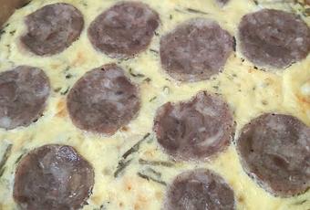 Verter sobre la base de espárragos y decorar con las rodajas de butifarra o trocitos de bacon reservados. Cocer en el horno precalentado durante unos 15-20 minutos a 200ºC, o hasta que el relleno se vea consistente y la parte superior esté dorada. Puede servirse caliente o fría. Aunque a nosotros nos gusta más recien salida del horno