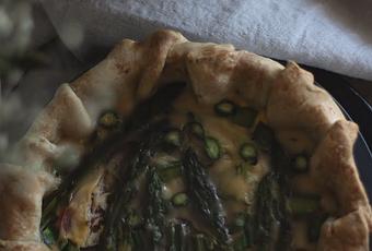 - Añadimos la mezcla sobre el molde forrado con la masa quebrada, y vamos echando los espárragos troceados y los tomates cherry.
