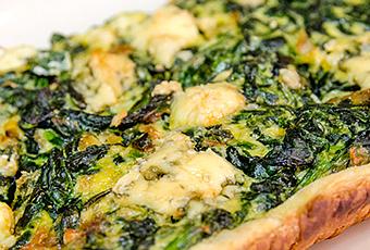 Ingredientes (6p): 1 rollo de masa de hojaldre, 2 paquetes de espinacas congeladas, 2 cebollas, 50 gr. mantequilla, 6 cucharadas de pan rallado, tacos de queso azul, 6 huevos, 4dl. nata liquida, perejil fresco, sal, pimienta aceite de oliva y nuez moscada.