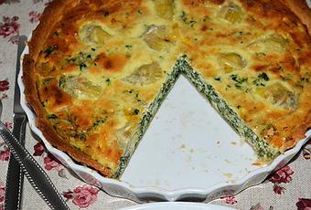 En un bol, mezclamos los huevos, la leche (o nata), sal, pimienta y nuez moscada, añadimos las espinacas y la mitad del queso y vertemos en el molde. Colocamos las alcachofas por encima y espolvoreamos con el resto de queso.