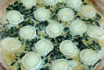 Poner el relleno sobre la base y colocar las rodajas de rulo de cabra por encima y hornear durante 30 minutos, hasta que al pinchar con un cuchillo éste salga limpio.