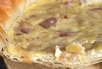 Forra tu molde con papel vegetal. Pincela con mantequilla diluida cada una de las láminas de masa philo, deben de impregnarse por todos los lados. Coloca a tu gusto en tu molde.