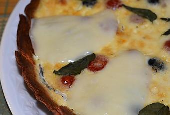 Lavamos las hojas de albahaca y las secamos bien. Cortamos el queso mozzarella en trozos pequeños y los distribuimos sobre la quiche caliente junto a la albahaca.