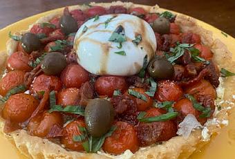 - Queso Philadelphia para untar la base- 3 Tomates secos hidratados en aceite 8 los venden en muchos supermercados. - Orégano seco, especie- Sal y pimienta- Ajo molido seco , en especies- Aceite de oliva- Albahaca fresca- 1 burrata- Un chorrito de reducción vinagre balsámico- 600 gr. de tomatitos cherry aproximadamente - 6 o 7 aceitunas negras