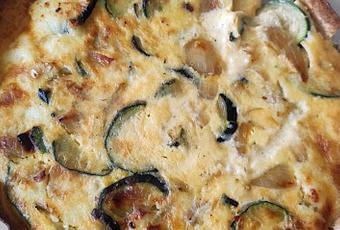 Calentar en una sartén 2 cucharadas de aceite y pochar 5 minutos la cebolla, el calabacín y el ajo.