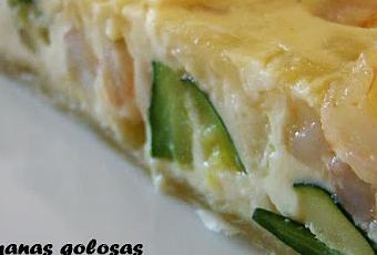En un bol he batido los huevos, la leche, el queso, la pimienta negra recien molida y la nuez moscada al gusto con una pizca de sal. Le he añadido las gambas y la cebolla y he mezclado.