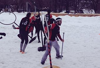 Nótese cómo el manual señala que lo juegan atletas y no nerds. Pues si bien al inicio la gente "iba por Harry Potter y se queda por el deporte", últimamente hay jugadores que ni siquiera han leído los libros pero les encanta correr en una escoba entre las piernas. Y eso lo hace realmente interesante porque todas las cosas se deben hacer con una sola mano. Tuve la oportunidad de ver un partido de Quidditch por primera vez cuando visité la Universidad McGill, en Montreal. Yo conversaba con el jugador snitch, ya que su rol es muy demandante (huír de doce jugadores al mismo tiempo) no está en el campo durante todo el partido. A pesar de que había unos 30 centímetros de nieve, los jugadores alinearon las pelotas en el centro del campo de juego, colocaron los aros a cada lado y esperaron el silbatazo inicial del arbitro.