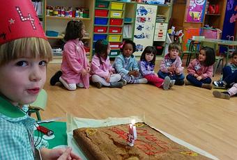 Hoy hemos celebrado el cumpleaños de nuestro amigo Flavio. Estaba muy contento porque ya tiene 4 años, y nos ha invitado a un bizcocho riquísimo.