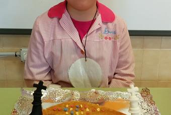Es la segunda de la clase que los cumple, y nos ha traído un bizcocho de ajedrez con dos reyes.