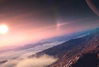 Impresión artística de un exoplaneta visto desde uno de sus satélites. Crédito: IAU/L. Calçada.